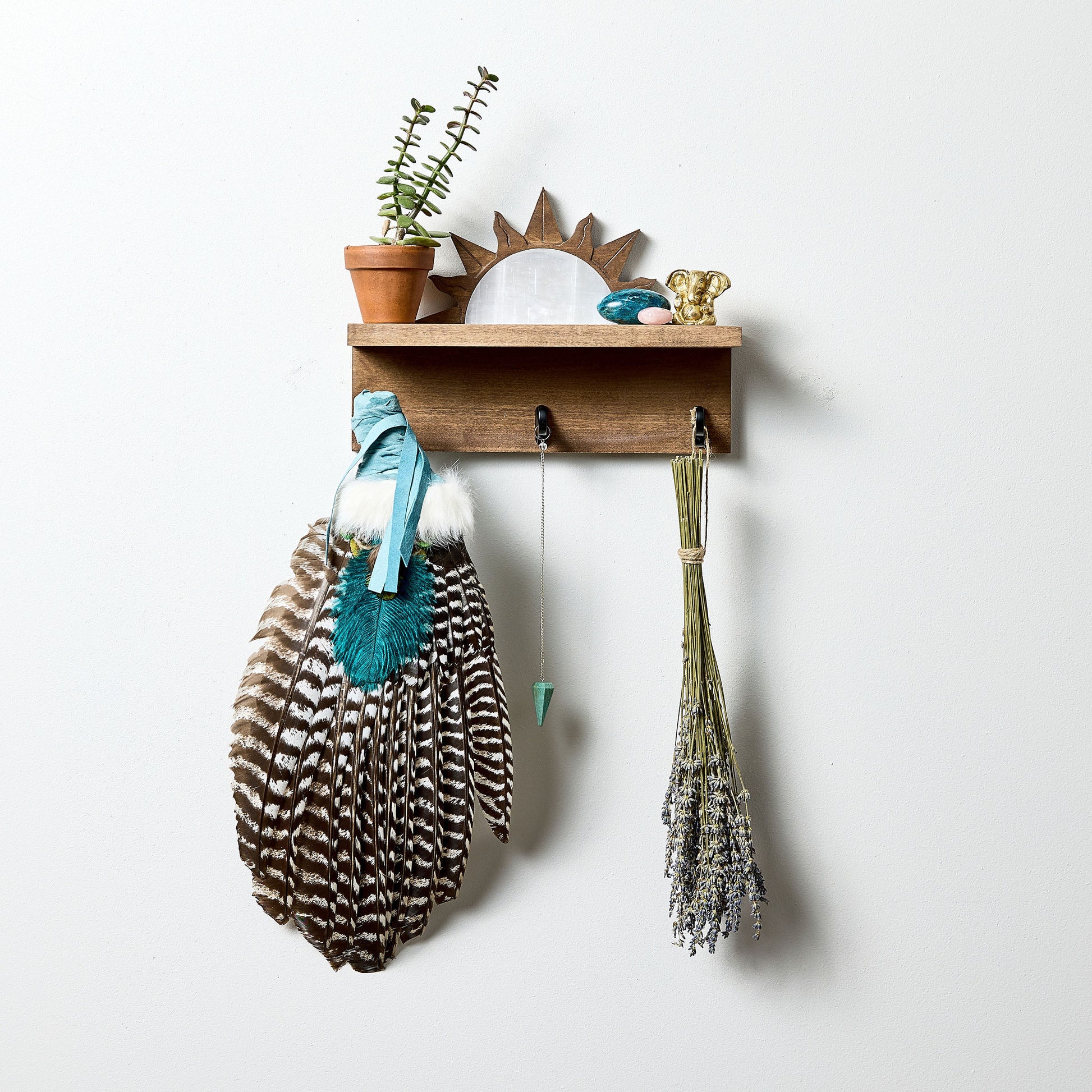 This versatile coat rack features a small shelf that can be used to keep your keys and wallet by your front door, or can be used as a wall altar to hold your crystals, sage and statuettes.
